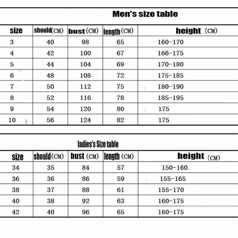 | Size | MAN-XS/3, MAN-S/4, MAN-M/5, MAN-L/6, MAN-XL/7, MAN-2XL/8, MAN-3XL/9, MAN-4XL/10, WOMAN-S/34, WOMAN-M/36, WOMAN-L/38, WOMAN-XL/40, WOMAN-2XL/42 |